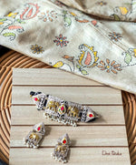 Oxidised Silver and Gold plated metal, vibrant pink stones paired with brown gemstone pendant.
