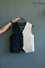 Elevate your wardrobe with the Noir Blanc Vest, a unique blend of contrasting prints that merge contemporary fashion with artisanal charm. The asymmetric black and white design, accented with subtle handwoven motifs, creates a bold yet elegant statement. Crafted from breathable fabric, this structured vest coat is perfect for layering over ethnic or western outfits, making it a must-have for effortless styling.